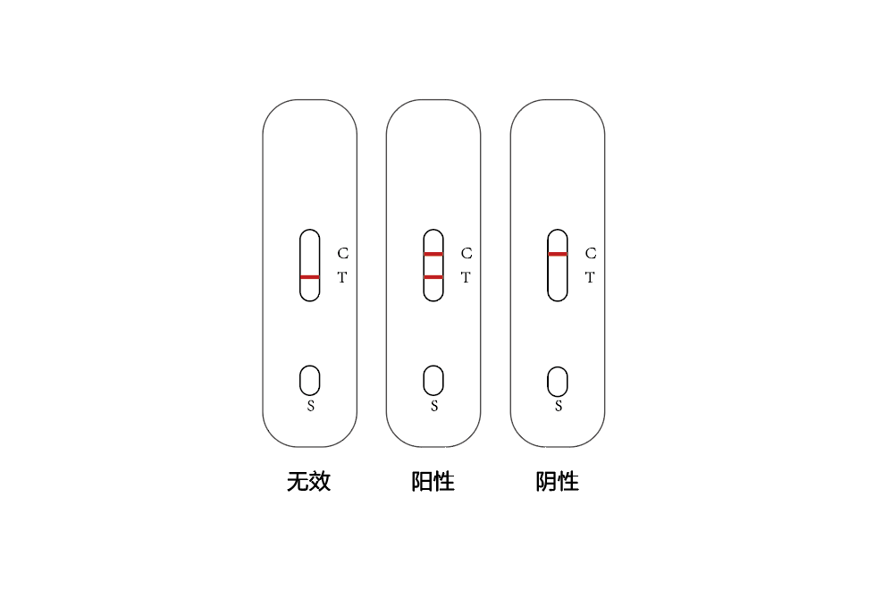 阳性(+):两条红色条带出现。一条位于检测区(T)内,另一条位于质控区(C)内。检测区(T)条带颜色可深可浅,均